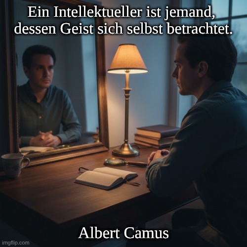 Der Geist kann sich selbst beobachten (Metakognition); man kann die eigenen Gedanken, Annahmen und Motive kritisch hinterfragen. Implizit schwingt möglicherweise auch eine leichte Ironie mit: Ein Intellektueller kann so sehr mit Selbstbeobachtung beschäftigt sein, dass er den Bezug zum Leben verliert. 📚 Ursprung: Ursprünglicher Kontext: Camus’ Notizbücher (aphoristische, kurze Beobachtungen). Zitat in Oxford Reference Works: Carnets (Notizbücher), 1935–1942 – oft als 1935–42 verfasst, posthum veröffentlicht (1962). Die gebräuchliche englische Form lautet: „An intellectual is someone whose mind watches itself.“ ✍️ Autor: Albert Camus (1913–1960) ✅. Oxford-Quellen wie das Oxford Dictionary of Quotations und die Oxford Essential Quotations führen es unter Camus mit Bezug auf Carnets/Notebooks (1935–42) auf, was die Zuschreibung stark unterstützt.
