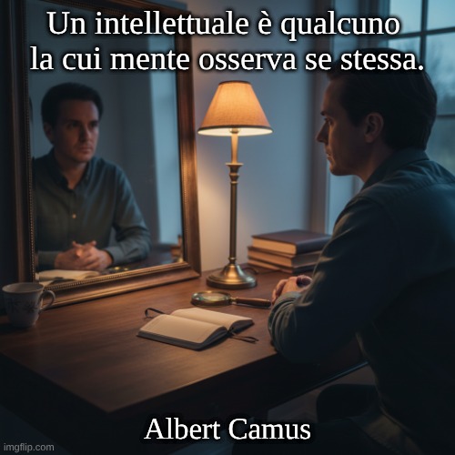 La mente può osservare se stessa (metacognizione); si possono esaminare criticamente i propri pensieri, presupposti e motivazioni. Implicitamente, può esserci anche una leggera sfumatura ironica: un intellettuale può essere così assorto nell’auto-osservazione che l’azione/la vita diventano distaccate. 📚 Origine: Contesto originale: i quaderni di Camus (brevi osservazioni aforistiche). Citazione come nelle opere di riferimento di Oxford: Carnets (Quaderni), 1935-1942 — spesso citati come scritti nel 1935-1942, pubblicati postumi (1962). ✍️ Autore: Albert Camus (1913–1960) ✅. Fonti di Oxford come Oxford Dictionary of Quotations e Oxford Essential Quotations lo elencano sotto Camus con riferimento a Carnets/Notebooks (1935–42), il che supporta fortemente l’attribuzione.