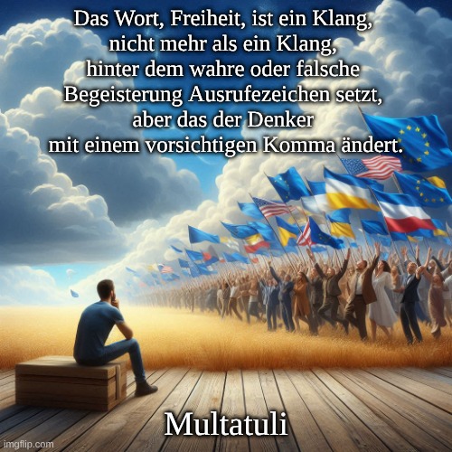 Bild: Peter van Geest AI. Bedeutung:Freiheit: Das Zitat reflektiert über die Bedeutung des Wortes „Freiheit”. Es betont, dass Freiheit mehr ist als nur eine emotionale oder enthusiastische Reaktion; sie erfordert auch eine sorgfältige und durchdachte Herangehensweise. Herkunft: Multatulis Werke sind oft von seiner kritischen Sicht auf die Gesellschaft und die menschliche Natur durchdrungen. Er nutzte seinen Schreibstil, um wichtige gesellschaftliche Themen anzusprechen und die Leser zu ermutigen, tiefgründig über komplexe Konzepte wie Freiheit nachzudenken. Autor:Multatuli, Pseudonym von Eduard Douwes Dekker, einem einflussreichen niederländischen Schriftsteller und Sozialkritiker des 19. Jahrhunderts. Er ist vor allem für seinen Roman „Max Havelaar” bekannt, in dem er die sozialen Ungleichheiten seiner Zeit anprangerte.