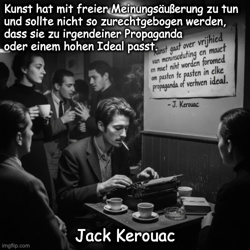 Bild: Peter van Geest AI. Bedeutung 🎭:Dieses Zitat betont Folgendes: Meinungsfreiheit als Kern: Es besagt, dass Kunst in ihrer reinsten Form ein Mittel ungehinderten Ausdrucks ist. Künstler müssen die Freiheit haben, ihre Gedanken, Gefühle, Beobachtungen und Kritiken ohne äußeren Druck auszudrücken. Ablehnung von Manipulation: Die Formulierung „nicht für Propagandazwecke missbraucht werden“ bedeutet, dass Kunst nicht dazu benutzt werden darf, politische, ideologische oder kommerzielle Botschaften zu verbreiten, die die Wahrheit verzerren oder einseitig sind. Kunst darf kein Instrument der Überzeugung sein, das einer externen Agenda dient. Unabhängigkeit von Idealen: „Oder hohen Idealen“ impliziert, dass selbst edle oder scheinbar gute Ideale die Kunst nicht einschränken oder diktieren sollten. Kunst muss die Freiheit bewahren, die Komplexität der menschlichen Erfahrung zu erforschen, einschließlich ihrer weniger wünschenswerten Aspekte, und darf nicht auf ein Mittel reduziert werden, um einem bestimmten moralischen oder sozialen Zweck zu dienen. Authentizität statt Konformität: Letztendlich plädiert das Zitat für Authentizität und Integrität in der Kunst, wo die Vision des Künstlers über äußeren Erwartungen oder Forderungen steht. Herkunft und Autor: 🤔 Die Herkunft dieses Zitats ist interessant und etwas komplexer, als es auf den ersten Blick scheint. Jack Kerouac: Es ist sehr wahrscheinlich, dass Jack Kerouac der Autor dieses Zitats ist. Er war bekannt für sein Eintreten für Spontaneität, Freiheit und unverblümten Ausdruck in seinem Werk und Leben – charakteristisch für die Beat Generation. Dieses Zitat passt perfekt zu seiner Philosophie des Schreibens und der Kunst. Bezug zu „Die Dharma-Bums“: Obwohl die obige Formulierung nicht direkt als einzelner Satz in seinem berühmten Roman „Die Dharma-Bums“ (1958) vorkommt, sind die darin ausgedrückten Ideen und Prinzipien tief in Kerouacs Denken und insbesondere in diesem Buch verwurzelt. „Die Dharma-Bums“ behandelt Themen wie spirituelle Suche, Natur, Freundschaft und insbesondere die Abneigung gegen gesellschaftliche Konformität und Materialismus. Kerouacs Figuren, oft Alter Egos von ihm selbst und seinen Freunden, äußern häufig ähnliche Gedanken über das Bedürfnis nach künstlerischer und persönlicher Freiheit. Die allgemeine Stimmung der Beat Generation: Die Beat Generation, der auch Kerouac angehörte, lehnte die konformistische Kultur der 1950er-Jahre vehement ab und setzte sich für Individualität, Rebellion gegen gesellschaftliche Normen und ungehemmten künstlerischen Ausdruck ein. Dieses Zitat bringt die Essenz dieser Bewegung perfekt auf den Punkt. Fazit: Die Aussage ist mit hoher Wahrscheinlichkeit Jack Kerouac zuzuschreiben. Sie fasst treffend seine künstlerische Philosophie und die übergeordneten Ideale der Beat Generation zusammen, die Kunst als Leuchtfeuer der Freiheit und Unabhängigkeit von jeglicher Konditionierung oder Manipulation verstand.