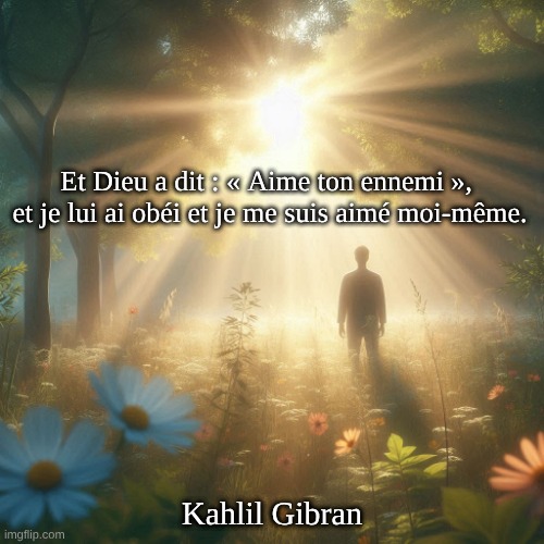 Philosophie existentielle : selon les interprétations sur Medium et d’autres blogs philosophiques, le message est que nous sommes souvent notre propre pire ennemi et que l’amour de soi est une forme d’obéissance spirituelle, non pas à un ennemi extérieur, mais à la réalité que l’amour doit commencer par soi-même. Source : Spiritual Sayings of Kahlil Gibran (1962). (Version originale).