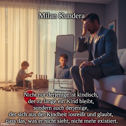 Botschaft: Erwachsensein bedeutet, das Unsichtbare und Abwesende zu berücksichtigen – die Vergangenheit, Verantwortung, das Leid anderer, Tatsachen, die aus dem Blickfeld verdrängt werden. Dies zu ignorieren ist moralisch und intellektuell kurzsichtig. Ursprung und Kontext 🧭: Dieses Zitat steht in engem Zusammenhang mit dem zentralen Thema von Kunderas Roman: dem Auslöschen von Erinnerungen (sowohl privaten als auch politischen), dem Umschreiben der Geschichte und der Versuchung, so zu tun, als existiere das, was aus dem Blickfeld verschwunden ist, nicht. Die Formulierung verweist implizit auf das psychologische Konzept der „Objektpermanenz“ (Piaget): die Erkenntnis, dass Dinge weiterhin existieren, auch wenn man sie nicht sieht. Originalformulierung (oft zitierte französische Version) 🇫🇷: „N’est pas infantile seulement celui qui reste enfant trop longtemps; l’est also celui qui s’arrache à l’infance et croit que th’il ne voit pas n’existe plus.“ Werk: Milan Kundera, Le Livre du rire et de l’oubli (1979). Die niederländische Version ist eine Übersetzungsvariante; Der Wortlaut kann je nach Ausgabe leicht abweichen.