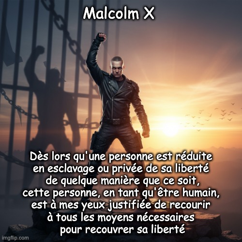 Image: Peter van Geest AI. Signification :Message clé : Cette citation souligne le droit de chaque être humain à lutter pour sa liberté. Elle suggère que toute personne opprimée ou réduite en esclavage a le droit d’utiliser tous les moyens nécessaires pour recouvrer sa liberté. Éthique de la résistance : L’idée que la liberté est un droit humain fondamental et que les individus ne doivent pas rester passifs face à l’injustice. Origine :Contexte : Cette citation trouve son origine dans la longue histoire de l’esclavage et de l’oppression, notamment dans le contexte de la lutte des Afro-Américains pour les droits civiques et la justice sociale. Inspiration : L’idée que chacun doit toujours pouvoir s’opposer à l’oppression trouve son origine chez plusieurs figures historiques et mouvements qui ont résisté à l’injustice. Auteur :Malcolm X : Bien que cette citation soit souvent attribuée à Malcolm X, il est important de noter que des idées similaires ont été exprimées par d’autres leaders et penseurs. Activisme : Malcolm X était un militant des droits civiques de premier plan et un fervent défenseur des droits des Afro-Américains aux États-Unis, en particulier dans les années 1960. Résumé : Cette déclaration souligne le droit de résister à l’oppression et reflète la lutte plus large pour la liberté et l’égalité. Malcolm X est une figure importante dans ce contexte, mais l’idée elle-même est intemporelle et universelle.