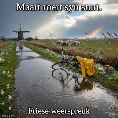 Afbeelding: Peter van Geest AI. 🧠 Betekenis: Maart is een grillige maand: Het weer kan plots omslaan met wind, regen, hagel of zelfs sneeuw. Het gezegde waarschuwt dat de winter in maart nog “na-ijlt” en zich soms nog even laat voelen. 🌦️ 🐾 Beeldspraak: “Roert zijn staart” verwijst naar een dier dat onvoorspelbaar met zijn staart slaat: speels, maar soms venijnig. Het verbeeldt de kuren van het maartse weer. 🕰️ Oorsprong:Taal: West Fries (syn = zijn, sturt = staart). Regionaal gebruik: Vooral in Fryslân; de Nederlandse vorm is overal in Nederland en Vlaanderen bekend. 🌍 Volkswijsheid uit de Lage Landen, ontstaan uit agrarische / weerobservaties in de overgang van winter naar lente. In druk overgeleverd sinds minstens de 17e–18e eeuw; nadien breed gedocumenteerd in spreekwoordenverzamelingen. De uitdrukking is vermoedelijk nog ouder in de mondelinge traditie. 📜 ✍️ Auteur: Geen individuele auteur: het is een anoniem, traditioneel spreekwoord uit de volksmond.
