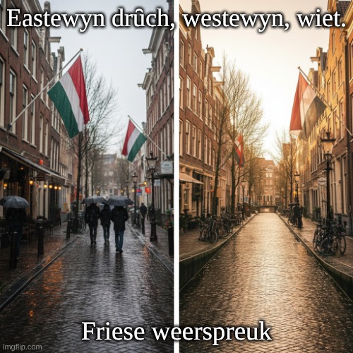 Afbeelding: Peter van Geest AI. Betekenis 💨➡️🌤️ | 💨⬅️🌧️ :Letterlijk: Oostenwind is droog; westenwind is nat. Vrij vertaald: wind uit het oosten brengt meestal droger (en vaak helderder) weer; wind uit het westen brengt vaker regen. Taal en spelling. Taal: West-Fries (Frysk). Vorm: gebruikelijk is “drûch” (met û) en “East(e)wyn”/“Eastenwyn”. De variant “drȗch” is een niet-standaard diakritische weergave. Interpunctie: doorgaans zonder komma na “westewyn”:“Eastewyn drûch, westewyn wiet.” Oorsprong en achtergrond: Herkomst: Friese/kust-Nederlandse volkswijsheid, bekend uit mondelinge traditie en verzamelingen van Friese spreekwoorden. 🧭 Meteorologische basis: Westenwinden in de Lage Landen voeren maritieme, vochtige lucht aan vanaf Noordzee / Atlantische Oceaan → vaker neerslag. 🌊. Oostenwinden voeren continentale, drogere lucht aan → gemiddeld droger en helderder weer. 🌍 Auteur: Geen individuele auteur; het is een traditionele weerspreuk (anonieme volkswijsheid). ✍️ Gebruik en context: Gebruikt om het weer kort te duiden/voorspellen op basis van windrichting, vooral in Friesland en andere kustregio’s. 🧭🌦️.