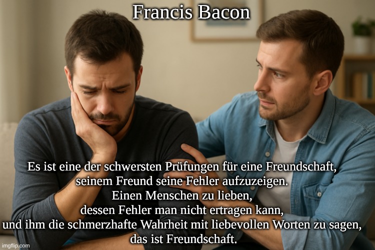Es ist eine der schwersten Prüfungen für eine Freundschaft, seinem Freund seine Fehler aufzuzeigen. Einen Menschen zu lieben, dessen Fehler man nicht ertragen kann, und ihm die schmerzhafte Wahrheit mit liebevollen Worten zu sagen, das ist Freundschaft.