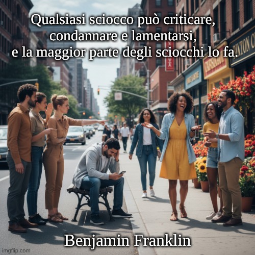 Immagine: Peter van Geest AI. Significato: La citazione sottolinea quanto sia facile per le persone criticare, giudicare gli altri e lamentarsi. Suggerisce che molte persone hanno questa tendenza e che si tratta di un comportamento comune. Origine: Questa citazione è spesso attribuita a Benjamin Franklin, sebbene non vi sia una fonte definitiva che la confermi. Tuttavia, l’idea alla base della citazione è coerente con la saggezza di Franklin e la sua visione critica della natura umana. Autore:Benjamin Franklin: uno dei padri fondatori degli Stati Uniti, noto per i suoi contributi alla politica, alla scienza e alla letteratura. Franklin era anche un commentatore sociale e i suoi detti riflettono spesso la sua intuizione sul comportamento umano. Riepilogo: La citazione è una riflessione sulla tendenza umana a criticare e lamentarsi, e sottolinea il lato più semplice di questi comportamenti.