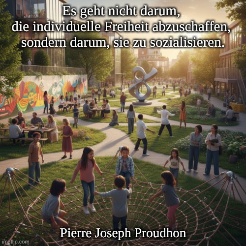 Bild: Peter van Geest AI. Bedeutung: Proudhon lehnte Staatszentralismus und jene Form des Sozialismus, die Staatseigentum und Bürokratie mit sich bringt, ausdrücklich ab. Er sah den Staat – selbst einen demokratischen – oft genauso tyrannisch wie eine Monarchie. Für ihn bedeutete „Vergesellschaftung“ auch: freiwillige Vereinigung, Eigentum auf der Grundlage von Nutzung/Besitz (nicht privater Anhäufung), Genossenschaften, direkte wirtschaftliche Demokratie und freie Vereinbarungen (Verträge) zwischen gleichberechtigten Produzenten/Konsumenten. Freiheit – sowohl individuelle als auch kollektive – ist für Proudhon nicht mit Gewalt zu erlangen, sondern entsteht aus freiwilligen, wechselseitigen Beziehungen zwischen Menschen. Quelle: Das System der ökonomischen Widersprüche oder Die Philosophie der Armut (Original: Système des contradictions économiques, ou Philosophie de la misère) von Proudhon.