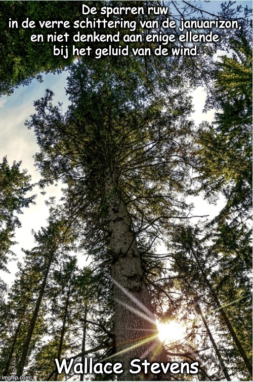 Foto 165106. Betekenis: Citaat Analyse: Sparren: Symbool voor de natuur, vaak geassocieerd met stabiliteit en kracht. Ruw: Kan duiden op een soort onvolkomenheid of authenticiteit in de natuur. Verre schittering van de januarizon: Dit beschrijft een specifieke, bijna magische kwaliteit van het licht in januari, wat kan wijzen op een nieuw begin of hoop. Niet denkend aan enige ellende: Dit suggereert een staat van zijn waarin men zich niet bewust is van problemen, wat kan leiden tot een gevoel van vrede. Geluid van de wind: Dit voegt een dynamisch element toe aan de beschrijving, wat de levendigheid van de natuur benadrukt. Oorsprong: Auteur: Wallace Stevens. Over Stevens: Een Amerikaanse dichter die bekend staat om zijn complexe en vaak filosofische poëzie. Hij verkent thema’s zoals de relatie tussen de mens en de natuur, de werkelijkheid en de verbeelding. Kenmerken van Stevens’ Werk:  Natuur en Beleving: Stevens gebruikt vaak de natuur als een manier om menselijke emoties en gedachten te verkennen. Symboliek: Zijn werk is rijk aan symboliek en metaforen, die uitnodigen tot diepere interpretatie. Esthetiek: Hij legt een sterke nadruk op de schoonheid van de wereld en de manieren waarop deze schoonheid ons kan beïnvloeden. Conclusie: Het citaat weerspiegelt Stevens’ kenmerkende stijl en zijn vermogen om de schoonheid van de natuur en de menselijke ervaring te vangen. Het biedt een moment van contemplatie en een gevoel van verbondenheid met de wereld om ons heen. 🌳✨