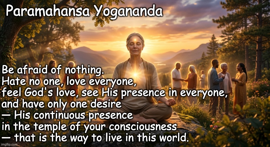 Be afraid of nothing. Hate no one, love everyone, feel God’s love. See His presence in everyone and have only one desire – His continuous presence in the temple of your consciousness – that is the way to live in this world.