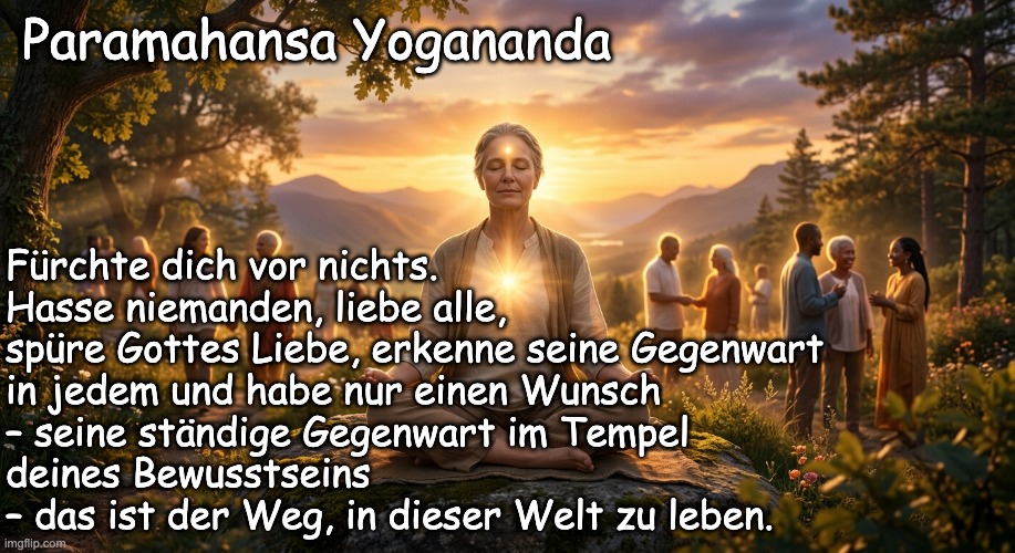 Bild: Peter van Geest AI. 🧘 Autor und Herkunft:Das Zitat wird Paramahansa Yogananda (1893–1952) zugeschrieben. Yogananda war ein indischer Yogi und Guru, der die Lehren des Kriya Yoga in den Westen brachte. Er ist weltberühmt für sein Buch „Autobiographie eines Yogi“. Kontext: Diese Worte fassen seine Kernphilosophie zusammen: die Verbindung tiefer Meditation mit einem aktiven, liebevollen Leben in der modernen Welt. Quelle: Obwohl dieses Zitat in dieser Form häufig in Anthologien und Kalendern der „Self-Realization Fellowship“ (der von ihm gegründeten Organisation) wiedergegeben wird, stammt seine Essenz aus seinen Lehren über „Weises und gutes Leben“. 📜 Tiefere Bedeutung des Zitats: Dieses Zitat ist ein Leitfaden für ein spirituelles Leben inmitten der Hektik des Alltags. Es lässt sich in vier Kernpunkte unterteilen: „Fürchte nichts“ 🛡️ Angst wird als Hindernis für spirituelles Wachstum gesehen. Indem man auf eine höhere Macht oder innere Stärke vertraut, überwindet man die Dualität der Welt. „Hass niemanden, liebe alle“ ❤️ Dies bezieht sich auf die Einheit aller Wesen. Hass ist Gift für die eigene Seele; Liebe ist der natürliche Zustand des Bewusstseins. „Seine Gegenwart in jedem sehen“ 👁️ Dies ist der Gedanke hinter „Namaste“: das göttliche Licht in sich selbst in den Augen des anderen zu erkennen, unabhängig von dessen Verhalten oder Herkunft. „Der Tempel deines Bewusstseins“ 🏛️ Yogananda lehrte, dass Gott nicht in Kirchen oder Tempeln wohnt, sondern vor allem in der Stille des eigenen Geistes. Durch Meditation machst du dein Bewusstsein zu einem heiligen Ort, an dem du stets Frieden finden kannst.✨ Kernpunkte dieses Lebensweges: Laut Yoganandas Lehre ist dies nicht nur ein schönes Ideal, sondern auch eine praktische Methode: Innere Loslösung: Du lebst in der Welt, aber du bist nicht von ihr beherrscht. Emotionale Ausgeglichenheit: Indem du die Liebe dem Hass vorziehst, bleibst du emotional stabil. Konzentriere dich auf die Quelle: Indem du stets mit deinem inneren Frieden (der „Präsenz“) verbunden bleibst, lassen dich Rückschläge nicht aus der Bahn werfen. Fazit: Dieses klassische Zitat von Yogananda bringt die Essenz seiner Yoga-Philosophie auf den Punkt: ein Leben, das in göttlichem Bewusstsein und universeller Liebe verwurzelt ist. 🙏✨