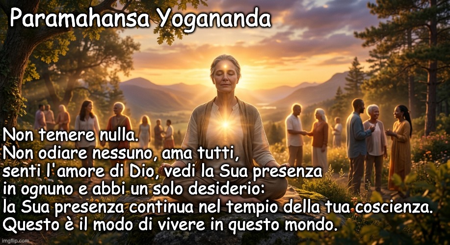Immagine: Peter van Geest AI. 🧘 Autore e origine:La citazione è attribuita a Paramahansa Yogananda (1893–1952). Yogananda era uno yogi e guru indiano che portò gli insegnamenti del Kriya Yoga in Occidente. È famoso in tutto il mondo per il suo libro “Autobiografia di uno Yogi”. Contesto: Queste parole riassumono la sua filosofia di base: combinare la meditazione profonda con una vita attiva e amorevole nel mondo moderno. Fonte: Sebbene questo detto specifico sia spesso condiviso in questa forma nelle antologie e nei calendari della “Self-Realization Fellowship” (l’organizzazione da lui fondata), l’essenza deriva dai suoi insegnamenti su “Vivere saggiamente e bene”. 📜 Significato più profondo del detto: Questa citazione è un modello per una vita spirituale in mezzo alla frenesia quotidiana. Può essere suddivisa in quattro parti principali: “Non temere nulla” 🛡️ La paura è vista come un blocco alla crescita spirituale. Confidando in un potere superiore o nella forza interiore, si supera la dualità del mondo. “Non odiare nessuno, ama tutti” ❤️ Questo si riferisce all’unità di tutti gli esseri. L’odio è veleno per la propria anima; l’amore è lo stato naturale della coscienza. “Vedere la Sua presenza in ognuno” 👁️ Questo è il concetto del pensiero “Namaste”: riconoscere la luce divina dentro di sé negli occhi dell’altro, indipendentemente dal suo comportamento o dal suo background. “Il tempio della tua coscienza” 🏛️ Yogananda insegnava che Dio non dimora nelle chiese o nei templi, ma principalmente nel silenzio della propria mente. Attraverso la meditazione, si rende la propria coscienza un luogo sacro dove si può sempre trovare la pace.✨ Punti chiave di questo stile di vita: Secondo gli insegnamenti di Yogananda, questo non è solo un bellissimo ideale, ma un metodo pratico:Distacco interiore: Si vive “nel” mondo, ma non se ne è posseduti. Equilibrio emotivo: Scegliendo l’amore anziché l’odio, si rimane emotivamente stabili. Concentrati sulla fonte: rimanendo costantemente in contatto con la tua pace interiore (la “presenza”), non verrai travolto dalle difficoltà. Conclusione: è una citazione classica di Yogananda che cattura l’essenza della sua filosofia yoga: vivere una vita radicata nella coscienza divina e nell’amore universale. 🙏✨