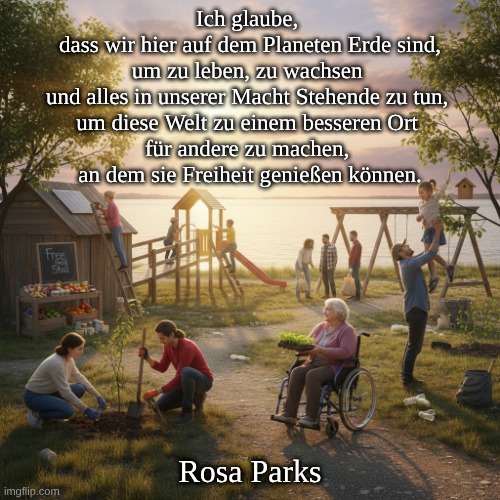 Universelle Freiheit: Nicht nur für Sie selbst, sondern „für alle Menschen“ – ein direktes Echo des Bürgerrechtskampfes. Im Einklang mit dem Ethos von Parks: Eigenverantwortung und friedliche Entschlossenheit. Freiheit als kollektives Gut, das nur dann vollständig ist, wenn jeder es genießen kann. Autor 🧑🏾🦱: Wahrscheinlicher Autor: Rosa Parks (1913–2005), Ikone der amerikanischen Bürgerrechtsbewegung. Online und in Anthologien wird dieses Zitat standardmäßig unter ihrem Namen platziert. Herkunft/Quelle 🔎: Häufig zitiert ohne Primärquellenangabe. Die Stimmung spiegelt Parks‘ eigene Worte in ihren Memoiren und Reflexionen wider, zum Beispiel in: „Rosa Parks: My Story“ (1992). „Stille Stärke“ (1994). Hinweis: Eine genaue Seiten- oder Interviewquelle für diesen spezifischen Ausdruck wird selten angegeben. Es handelt sich wahrscheinlich um eine Paraphrase oder häufig verwendete Übersetzungsvariante einer Aussage, die durch Zitatsammlungen verbreitet wurde. Häufig verwendete englische Version: „Ich glaube, dass wir hier auf dem Planeten Erde sind, um zu leben, aufzuwachsen und zu tun, was wir können, um diese Welt zu einem besseren Ort zu machen, an dem andere ihre Freiheit genießen können.“ Kontext und weiterführende Lesetipps 📚: Für den Kontext zu ihren Werten und ihrer Sprache: Rosa Parks & Jim Haskins – „Rosa Parks: My Story“ (1992).