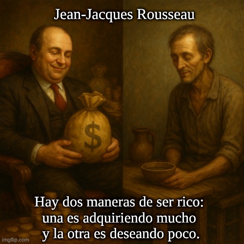 Imagen: Peter van Geest AI. Significado: El mensaje central es que la verdadera riqueza no proviene de lo que se tiene, sino de lo que no se necesita. Quienes desean poco viven con mayor libertad, paz y satisfacción, independientemente de sus posesiones. Fuente: Émile, ou De l’éducation (1762) – Rousseau
