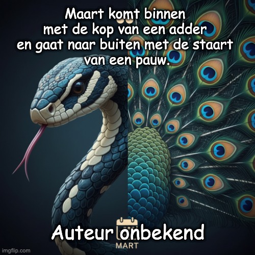 Maart komt binnen met de kop van een adder en gaat naar buiten met de staart van een pauw.