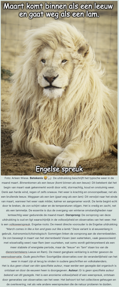 Afbeeling- Peter van Geest AI. Betekenis: De uitdrukking “Maart komt binnen met de kop van een adder en gaat naar buiten met de staart van een pauw” beschrijft de typische weersveranderingen die we in de maand maart ervaren. 🐍 “Komt binnen met de kop van een adder”: Dit verwijst naar het begin van maart, dat vaak nog koud, stormachtig en onvoorspelbaar kan zijn, net zoals een adder gevaarlijk en plotseling kan toeslaan. Denk aan winterse buien, scherpe wind en lage temperaturen die nog de invloed van de winter met zich meedragen. 🦚 “Gaat naar buiten met de staart van een pauw”: Dit symboliseert het einde van maart, wanneer het weer vaak milder, zonniger en aangenamer wordt. De staart van een pauw staat bekend om zijn schoonheid en pracht, wat de geleidelijke overgang naar de lente en de belofte van warmer weer weerspiegelt. Kortom, het gezegde benadrukt de grilligheid van het weer in maart, beginnend met winterse omstandigheden en eindigend met lentachtige taferelen. Oorsprong: De oorsprong van dergelijke weerspreuken is vaak moeilijk precies te achterhalen, omdat ze mondeling werden overgeleverd en deel werden van de volkswijsheid. Dit specifieke gezegde is waarschijnlijk van Engelse oorsprong en bestaat al eeuwen in verschillende vormen. Een veelvoorkomende Engelse variant is: “March comes in like a lion, and goes out like a lamb.” Dit Engelse gezegde heeft een vergelijkbare betekenis, waarbij de “leeuw” staat voor het wilde en stormachtige begin, en het “lam” voor het zachte en milde einde. Auteur:Vaak toegeschrven aan Richard Lawson Gales, er is echter geen algemeen bekende koppeling tussen hem en dit specifieke gezegde. De meeste weerspreuken en volkswijsheden zijn van anonieme oorsprong en zijn door de eeuwen heen geëvolueerd. Ze worden zelden aan één specifieke auteur toegeschreven, tenzij het om een literaire creatie gaat die later populair is geworden. Het is mogelijk dat Richard Lawson Gales dit gezegde heeft gebruikt of geciteerd in een van zijn werken, wat zou kunnen verklaren waarom zijn naam ermee in verband wordt gebracht. Echter, hij is niet de oorspronkelijke bedenker van de uitdrukking zelf. Samenvattend is het een prachtige weerspreuk die de veranderlijkheid van maart perfect illustreert. Het is waarschijnlijk een oude volkswijsheid, mogelijk met Engelse wortels, en niet direct toe te schrijven aan een specifieke auteur zoals Richard Lawson Gales als de bedenker.