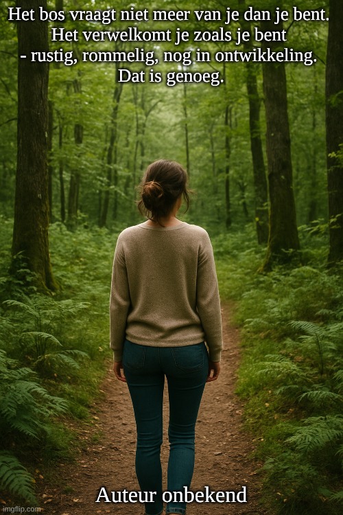 Het bos vraagt niet meer van je dan je bent. Het verwelkomt je zoals je bent – rustig, rommelig, nog in ontwikkeling. Dat is genoeg.