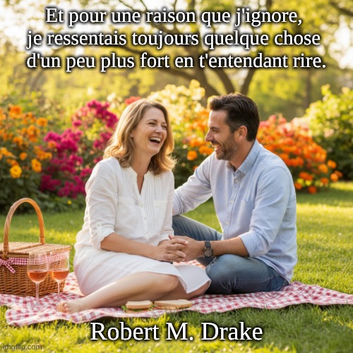 Image: Peter van Geest AI. Signification :Impact émotionnel : Cette citation décrit comment le rire d’un être cher suscite une profonde résonance émotionnelle. Elle illustre le pouvoir de la joie et du lien que l’on trouve dans les moments les plus simples. Lien personnel : Elle reflète une relation intime, où la personne qui cite se sent plus proche de l’autre grâce à la joie qu’elle éprouve en entendant son rire. Origine :Œuvres poétiques : On retrouve souvent les œuvres de Robert M. Drake sur les réseaux sociaux et dans des recueils de poésie, où il partage ses pensées et ses sentiments avec simplicité. Conclusion : Avec Robert M. Drake comme auteur, cette citation prend une dimension supplémentaire, car son œuvre aborde fréquemment les thèmes de l’amour et du lien émotionnel.