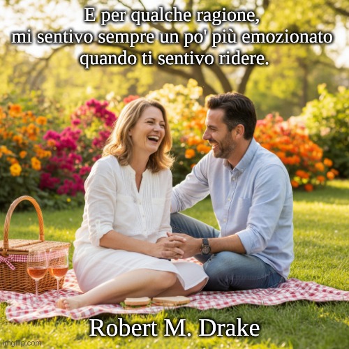 Immagine: Peter van Geest AI. Significato: Impatto emotivo: La citazione descrive come la risata di una persona cara evochi una risonanza emotiva più profonda. Questo può indicare il potere della gioia e della connessione che si trovano nei momenti semplici. Connessione personale: Riflette una relazione intima, in cui chi parla si sente più connesso attraverso la gioia che prova ascoltando la risata dell’altra persona. Origine: Opere poetiche: Le opere di Robert M. Drake si trovano spesso sui social media e nelle raccolte di poesie, dove condivide i suoi pensieri e sentimenti in modo accessibile. Conclusione: Con Robert M. Drake come autore, la citazione acquisisce ulteriore profondità, poiché le sue opere risuonano spesso con temi di amore e connessione emotiva.