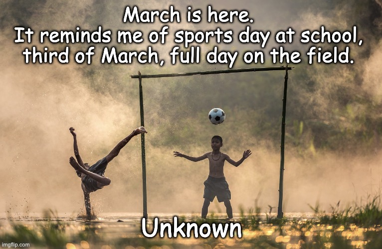 Photo: Sasin Tipchai. Meaning ✅🗓️🌱: This is not a classic English saying in the sense of a generally known proverbial expression. It reads more like a personal memory or literary phrase. Content meaning: “March is here” → the transition to a new month / the beginning of the spring period. Memory trigger → March evokes a very specific image: sports day at school. “March 3, a whole day on the field” → emphasizes: a fixed calendar reminder (date + ritual), nostalgia (school days), physical/collective experience (outside, field, day program). In short: it expresses how a month (March) can suddenly evoke a strong, concrete childhood memory. 🧭 Origin 📚: It cannot be traced back to a known proverb, proverb or standard “saying” in English sources. The style (“March is here.” short sentence + memory after it) does suit: literary prose opening (like a novel, diary entry, short story), or a personal quote (social media, blog, essay). 👉 Without a source (book/title, where you read it, screenshot, context), the origin cannot be reliably determined. ✍️ Author 👤:Unknown based on this sentence alone.