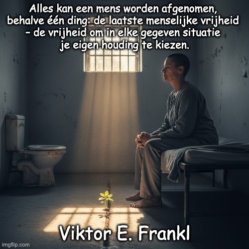 Afbeelding: Peter van Geest AI. Betekenis 🧭:De kern: zelfs als je bijna alle uiterlijke vrijheden verliest, blijft er één onvervreemdbare vrijheid over — je mag altijd je eigen houding, je innerlijke reactie, kiezen. Implicatie: je behoudt morele en existentiële verantwoordelijkheid; je bent geen louter passief slachtoffer van omstandigheden. Praktisch: je kunt lijden niet altijd vermijden, maar je kunt wél kiezen hoe je je ertoe verhoudt (zin geven, waardig handelen, richting blijven kiezen). Oorsprong en context 📚: Herkomst: uit Viktor E. Frankls boek “Man’s Search for Meaning” (Duits: “…trotzdem Ja zum Leben sagen”, 1946; Engelse editie 1959). Context: Frankl baseerde dit inzicht op zijn ervaringen als gevangene in naziconcentratiekampen. Hij observeerde dat mensen die betekenis en doel wisten te vinden veerkrachtiger waren. Filosofie: dit vormt een pijler van zijn logotherapie, waarin “wil tot betekenis” (het zoeken naar zin) centraal staat. Auteur ✍️: Viktor E. Frankl (1905–1997) — Oostenrijks neuroloog en psychiater, Holocaust-overlevende, grondlegger van de logotherapie (derde Weense school na Freud en Adler). Bekend om het idee dat zingeving essentieel is voor geestelijke gezondheid en menswaardig leven. Originele formulering en vertalingen 🌐: De Nederlandse zin die je citeert is een veelgebruikte parafrase. Engelse versie (bekendste): “Everything can be taken from a man but one thing: the last of the human freedoms—to choose one’s attitude in any given set of circumstances, to choose one’s own way.”Duitse weergave (vaak geciteerd, licht variërend per editie): “Man kann einem Menschen alles nehmen außer einer: der letzten der menschlichen Freiheiten – die Wahl der Einstellung zu den gegebenen Umständen, die Wahl des eigenen Weges.”Nuance ⚖️: Geen “toxic positivity”: het ontkent het lijden niet en vergoelijkt onrecht niet; het benadrukt innerlijke keuzevrijheid ondanks omstandigheden. Het is een oproep tot verantwoordelijkheid en waardigheid, niet tot schuldtoewijzing aan wie lijdt.