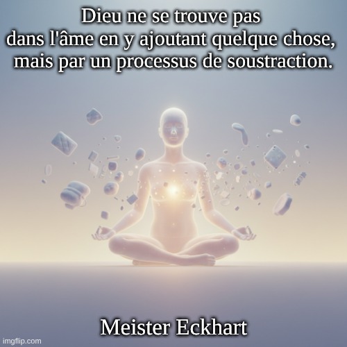Image: Peter van Geest AI. Signification 📚 : Cette citation indique une approche mystique du divin. Plutôt que de chercher Dieu en accumulant plus de connaissances, de rituels, de possessions ou même de vertus, cela suggère que le chemin vers Dieu consiste à lâcher prise et à supprimer tout ce qui n’est pas essentiel. « Ajouter n’importe quoi » : Cela fait référence aux tentatives de l’homme pour atteindre Dieu par des moyens extérieurs, des concepts, des images ou des désirs terrestres. Il peut s’agir de choses matérielles, mais aussi de constructions mentales ou encore d’exercices spirituels qui ne vont pas à l’essentiel. “Processus de soustraction” : Cela implique une purification intérieure. Il s’agit de supprimer tout ce qui nous sépare de la pure essence de Dieu en nous. Cela peut signifier : Abandonner l’ego, l’identité et l’égocentrisme. Transcender les désirs et les attachements terrestres. Se débarrasser des idées préconçues sur qui est Dieu. Atteindre un état de vide ou de non-connaissance dans lequel la vraie nature de Dieu peut se révéler. L’idée est que Dieu est déjà présent dans l’âme, mais qu’il est éclipsé par des « ajouts ». La suppression de ces « ajouts » révèle la présence divine inhérente. 🌟Origine et auteur :  Maître Eckhart. Meister Eckhart (vers 1260 – vers 1328) était un théologien, philosophe et mystique allemand. C’était un frère dominicain dont l’œuvre a eu une profonde influence sur le mysticisme occidental. Contexte : Les enseignements d’Eckhart se concentraient souvent sur le « fondement » ou « l’étincelle » de l’âme, un lieu où l’âme est en contact direct avec Dieu, au-delà de toutes choses et concepts créés. Ses sermons et ses traités soulignent l’importance de la résignation (Abgeschiedenheit) et de la pauvreté de l’esprit (Armut im Geist), ce qui revient précisément à ce « processus de soustraction ». En vous détachant de tout – y compris de votre propre volonté, de vos pensées et de vos images de Dieu – vous créez un espace pour l’expérience immédiate de Dieu. Bien que la formulation exacte      « Dieu ne se trouve pas dans l’âme par addition de quoi que ce soit, mais par un processus de soustraction » puisse être une traduction ou une paraphrase moderne, elle capture parfaitement l’essence de l’enseignement d’Eckhart. Beaucoup de ses écrits transmettent ce message, quoique dans un langage théologique plus complexe. Conclusion : Il est très probable que cette citation, ou son noyau, vienne de Maître Eckhart et de sa philosophie mystique sur l’immanence de Dieu dans l’âme et le chemin du vide pour faire l’expérience de Dieu. Imaginez abandonner tout ce que vous pensez être ou avoir besoin, afin d’aller au cœur de votre être.