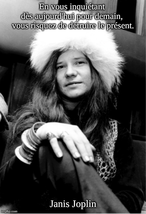 Photo: Picture alliance Photoshot. Signification :Interprétation : Cette citation souligne l’idée que s’inquiéter excessivement de l’avenir peut nous empêcher de profiter du moment présent. Elle nous encourage à vivre pleinement le moment présent et à apprécier ce que nous avons, plutôt que d’être submergés par les soucis concernant l’avenir. Origine : Ce dicton a une base philosophique et est souvent associé à la pleine conscience et à l’importance de vivre l’instant présent. C’est un message qui a été communiqué sous diverses formes à travers le temps. Auteur : L’auteur de cette citation est incertain. Bien qu’elle soit souvent attribuée à Janis Joplin, il n’existe aucune preuve concrète qu’elle ait prononcé ou écrit ces mots précis. L’idée de vivre l’instant présent et les conséquences de l’inquiétude excessive sont des thèmes explorés dans de nombreuses cultures et par divers auteurs. Résumé : Essentiel : Ne vous inquiétez pas trop de l’avenir ; appréciez le présent. Usage : Ce dicton est souvent utilisé pour encourager les gens à vivre davantage dans le moment présent et à moins s’inquiéter de l’avenir.