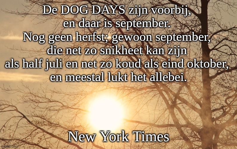 De DOG DAYS zijn voorbij, en daar is september. Nog geen herfst; gewoon september, die net zo snikheet kan zijn als half juli en net zo koud als eind oktober, en meestal lukt het allebei.