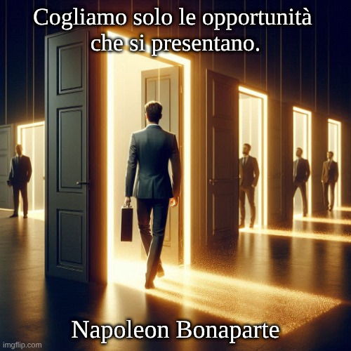 Immagine: Peter van Geest AI. Significato: Cogliere un’opportunità e perseguirla attivamente spesso porta a nuove opportunità. Incoraggia l’azione e l’iniziativa: agendo invece di aspettare, si crea una dinamica in cui si presentano nuove possibilità. Chi resta a guardare e lascia che le opportunità gli passino accanto scoprirà che se ne presentano sempre meno. Ma chi è attivo e coglie le opportunità vede come un’opportunità porta a un’altra. Contesto: Napoleone era noto per la sua risolutezza e la sua capacità di agire rapidamente quando si presentava una situazione favorevole. Questo detto si adatta alla sua filosofia militare e politica: il successo non deriva dall’attesa passiva, ma dal creare attivamente slancio.