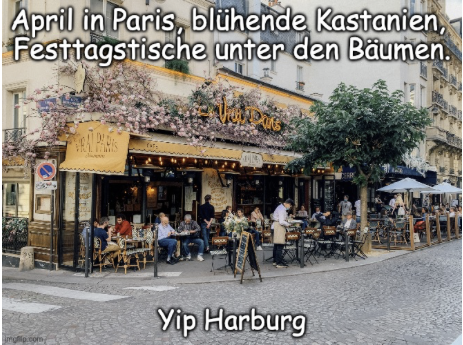 Foto: Alex Harmuth. Bedeutung 🤔: 🌸 Diese Redewendung ruft ein ganz bestimmtes und idyllisches Bild hervor. Sie vermittelt ein Gefühl von ‘Romantik, Nostalgie und der Verheißung des Frühlings’.Sie symbolisiert: 🎉 Freude und Festlichkeit: Die „festlich gedeckten Tische unter den Bäumen“ stehen für Geselligkeit, Zusammengehörigkeit und das Feiern des Lebens im Freien. 🌱 Neubeginn: Der Frühling („April“, „blühende Kastanien“) ist traditionell eine Zeit der Wiedergeburt und der Hoffnung. 💖 Der Zauber von Paris: Die Stadt Paris selbst wird oft mit Liebe und Romantik in Verbindung gebracht, und diese Redewendung verstärkt dieses Bild. Kurz gesagt, es ist ein Ausdruck, der einen Moment vollkommenen Glücks, Schönheit und unbeschwerter Leichtigkeit beschreibt, oft verbunden mit einer Sehnsucht nach genau dieser besonderen Atmosphäre. 📜 Ursprung und Autor: Der Ursprung liegt im weltberühmten Lied „April in Paris“. 🎬 Das Original: Das Lied wurde ursprünglich 1932 für das Broadway-Musical „Walk a Little Faster“ geschrieben. ✍️ Der Texter: Der Text stammt von E.Y. „Yip“ Harburg. 🎶 Der Komponist: Die Musik wurde von Vernon Duke komponiert. Der Song wurde erst in den 1950er-Jahren durch Count Basies Jazz-Version zum Welthit. Später coverten unzählige Künstler, darunter Ella Fitzgerald und Frank Sinatra, das Lied und machten so den Text und die damit verbundenen Bilder weltweit bekannt. Die ersten Zeilen des Refrains: „April in Paris, chestnuts in blossom, Holiday tables under the trees…“ 💡 Wissenswertes: 🌳 Die Rosskastanien: Rosskastanien (Châtaigniers) sind ein ikonischer Bestandteil der Pariser Boulevards und Parks, und ihre Blüte im Frühling ist ein wunderschöner Anblick. 🎧 Popkultur: Count Basies Auftritt ist so berühmt, dass der Ausruf „Noch einmal!“ (den er am Ende des Liedes ruft) selbst zu einem Jazz-Klischee geworden ist. Es ist eine wunderschöne Zeile, die die verträumte Atmosphäre eines Pariser Frühlings perfekt einfängt.