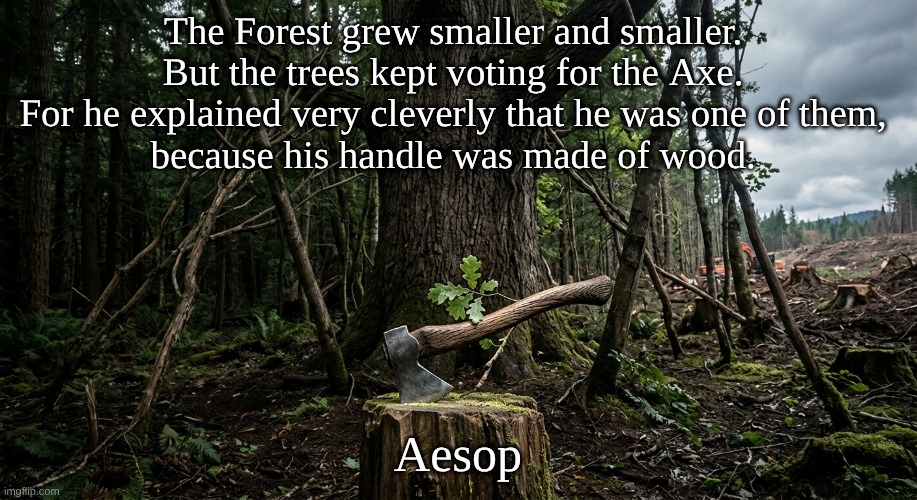 Image: Peter van Geest AI. Meaning 📖 💡: This saying is a powerful and widely used political allegory. It warns against manipulation and the consequences of voting against one’s own interests. The allegory works on several levels: The Metaphor: The Forest 🌳: Represents a group of people or a society. The Trees 🌲: Are the individual citizens, often those who are vulnerable or ordinary working people. The Axe 🪓: Symbolizes an external force, a dictator, an oppressive government, or a political system that will ultimately harm the group. The Wooden Handle 🪵: This is the crucial element. It is the deceptive connection the Axe uses to win the trust of the Trees. It is a superficial resemblance that is misleading. The Central Theme: The saying illustrates how people can be persuaded to support a leader or policy that will ultimately harm them. The Axe convinces the Trees that he is “one of them,” despite the fact that his true nature and function (a murder weapon) are destructive to them. 🏺 Origin and Variations: The origin of this fable is ancient and has deep roots in Western literature. Aesop’s Fables: The basic idea comes from the Greek fabulist Aesop (circa 600 BC). In his fable “The Woodcutter and the Forest,” a woodcutter asks the trees for a piece of wood for a handle for his axe. The trees, foolishly enough, grant his request. As soon as the axe has a handle, the woodcutter begins chopping down the forest. The moralizing ending warns against giving the means of destruction to your enemy. Various Versions: The concept has been adapted and reinterpreted over the centuries. There are versions in which the trees quarrel and choose a ‘king’ (the axe), who then destroys them. A well-known English version,“The Woodman and the Trees,” follows a similar story. 🖋️ Author of this Specific Version: The specific wording in your image: “The Forest grew smaller and smaller. But the trees kept voting for the Axe. For he told very cleverly, that he was one of them, because his handle was made of wood.” is a modern, highly concentrated paraphrase. It cannot be attributed to one specific modern author. Instead, it is an evolved, more cynical, and directly political version that has become popular in public debate and on social media. It is often used as a critique of populism or political ignorance. Conclusion:Although the core idea harks back to Aesop, the modern “voting for the axe” version has become a powerful, anonymous piece of political folklore. 🌳🪓
