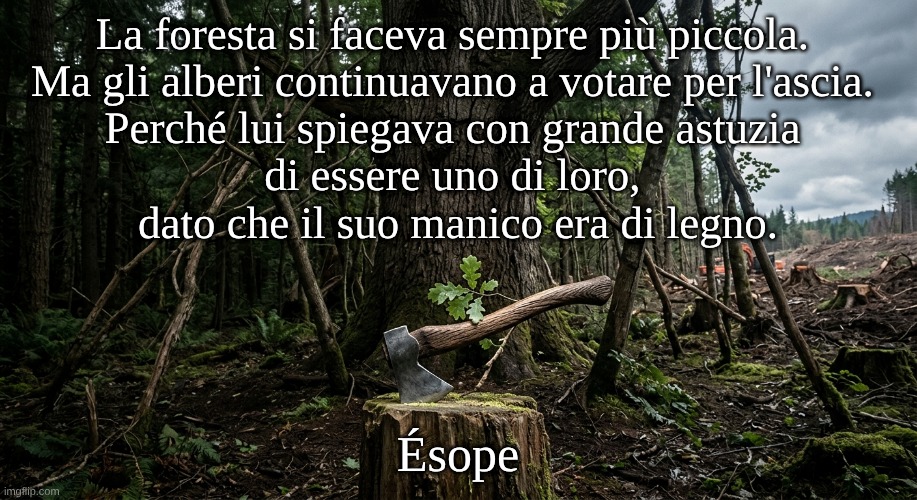 Immagine: Peter van Geest AI. Significato 📖 💡: Questo detto è una potente e diffusa allegoria politica. Mette in guardia contro la manipolazione e le conseguenze del votare contro i propri interessi. L’allegoria funziona su diversi livelli: La metafora: La foresta 🌳: Rappresenta un gruppo di persone o una società. Gli alberi 🌲: Sono i singoli cittadini, spesso quelli vulnerabili o i lavoratori comuni. L’ascia 🪓: Simboleggia una forza esterna, un dittatore, un governo oppressivo o un sistema politico che alla fine danneggerà il gruppo. Il manico di legno 🪵: Questo è l’elemento cruciale. È il legame ingannevole che l’ascia usa per conquistare la fiducia degli alberi. È una somiglianza superficiale che trae in inganno. Il tema centrale: Il detto illustra come le persone possano essere persuase a sostenere un leader o una politica che alla fine le danneggerà. L’ascia convince gli alberi di essere “uno di loro”, nonostante la sua vera natura e funzione (un’arma letale) siano distruttive per loro. 🏺 Origine e varianti: L’origine di questa favola è antica e affonda le sue radici nella letteratura occidentale. Favole di Esopo: L’idea di base proviene dal favolista greco Esopo (circa 600 a.C.). Nella sua favola “Il taglialegna e la foresta”, un taglialegna chiede agli alberi un pezzo di legno per fare il manico alla sua ascia. Gli alberi, ingenuamente, acconsentono alla sua richiesta. Non appena l’ascia ha il manico, il taglialegna inizia ad abbattere la foresta. Il finale moraleggiante mette in guardia dal dare i mezzi di distruzione al proprio nemico. Varie versioni: Il concetto è stato adattato e reinterpretato nel corso dei secoli. Esistono versioni in cui gli alberi litigano e scelgono un “re” (l’ascia), che poi li distrugge. Una nota versioneinglese, “The Woodman and the Trees”, segue una storia simile. 🖋️ Autore di questa specifica versione:La formulazione specifica nella tua immagine: “La foresta si faceva sempre più piccola. Ma gli alberi continuavano a votare per l’ascia. Perché egli disse con grande astuzia di essere uno di loro, perché il suo manico era di legno.” è una parafrasi moderna e altamente concentrata. Non può essere attribuita a un singolo autore moderno. Si tratta piuttosto di una versione evoluta, più cinica e direttamente politica, che è diventata popolare nel dibattito pubblico e sui social media. Viene spesso utilizzata come critica al populismo o all’ignoranza politica. Conclusione: Sebbene l’idea centrale risalga a Esopo, la versione moderna del “votare per l’ascia” è diventata un potente e anonimo elemento del folklore politico. 🌳🪓