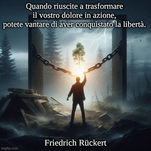 Immagine: Peter van Geest AI. Significato: Rückert sottolinea qui che la vera libertà nasce quando si vive la sofferenza o le avversità non solo come un dolore passivo, ma si agisce attivamente, trasformandoli in azioni. Grazie a questa trasformazione, ci si può legittimamente definire “orgogliosi” della libertà conquistata, perché si è contribuito personalmente al superamento dell’ostacolo invece di esserne semplicemente sopraffatti. In sostanza, si tratta di empowerment: agire contro le difficoltà porta alla liberazione interiore. Fonte: Raccolta di poesie Gedichte (pubblicata negli anni 1840-1850), poesia: “Die Freiheit”; in edizioni successive, la poesia è stata inclusa anche nella più ampia raccolta Gesammelte Werke (Opere complete) di Rückert.