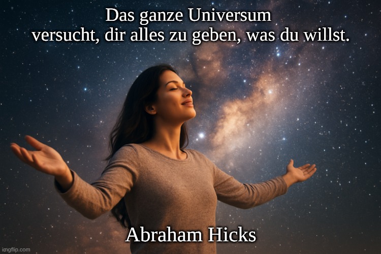 Bild: Peter van Geest AI. Bedeutung: Was du tief in deinem Inneren willst und glaubst, ziehst du an. Das Universum „versucht“, dir zu helfen, aber dein Fokus, deine Überzeugungen und deine Schwingung bestimmen, ob du diese Hilfe zulässt oder blockierst. Es ist ein ermutigender Gedanke, der Menschen dazu anregt, positiv zu denken, Vertrauen zu haben und ihre Wünsche klar zu formulieren. Quelle: Esther Hicks (mit ihrem übermittelten Wesen Abraham), vor allem bekannt durch The Law of Attraction und Ask and It Is Given (2004).