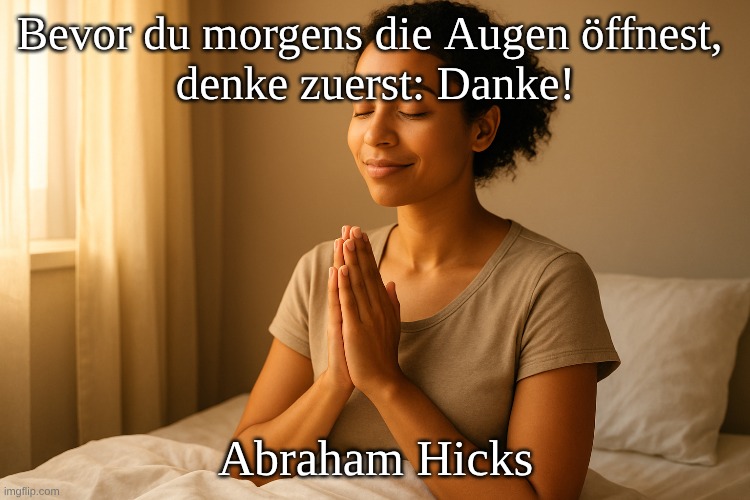Bild: Peter van Geest AI. Bedeutung: Der Spruch fasst ihre Lehre über die Bedeutung von Schwingung, Dankbarkeit und positiver Ausrichtung beim Anziehen gewünschter Erfahrungen zusammen. In der Lehre von Abraham-Hicks ist dies eine Übung, um Ihre Schwingung auf eine hohe Frequenz zu bringen, sobald Sie aufwachen. Indem Sie bewusst „Danke” denken, stimmen Sie sich auf Gefühle der Wertschätzung und Fülle ein – was laut dieser Philosophie den Ton für einen positiven Tag angibt und ähnliche Ereignisse anzieht. Herkunft: Esther Hicks (mit Verweis auf Abraham-Hicks). Zeitraum: Ende des 20. – Anfang des 21. Jahrhunderts. Quelle: kein offizielles Buchzitat, sondern aus ihren Vorträgen und Workshops über das Gesetz der Anziehung.