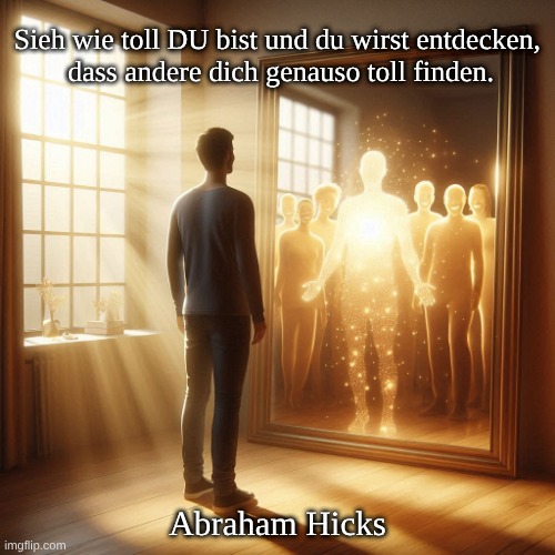 Bild: Peter van Geest AI. Bedeutung: Ein typisches Beispiel dafür, wie Abraham-Hicks psychologische Erkenntnisse in ihr „Gesetz der Anziehung”-Konzept übersetzt – mit dem Schwerpunkt darauf, dass deine Realität mit deinen eigenen Gedanken und Gefühlen über dich selbst beginnt. Herkunft: Esther Hicks ist bekannt für die Lehren von Abraham-Hicks – sie channelt nach eigenen Angaben eine Gruppe von Bewusstseinswesen namens „Abraham” und gibt Lehren über das Gesetz der Anziehung (Law of Attraction).