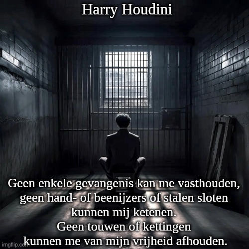 Geen enkele gevangenis kan me vasthouden, geen hand- of beenijzers of stalen sloten kunnen mij ketenen. Geen touwen of kettingen kunnen me van mijn vrijheid afhouden.