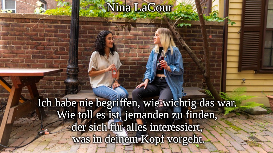 Ich habe nie begriffen, wie wichtig das war. Wie toll es ist, jemanden zu finden, der sich für alles interessiert, was in deinem Kopf vorgeht.