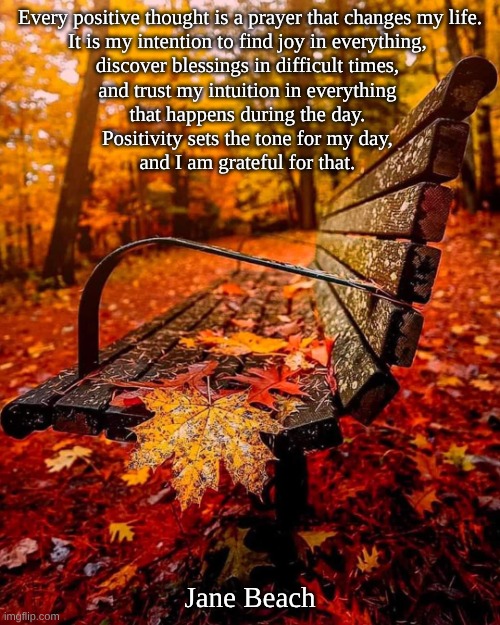 Every positive thought is a prayer that changes my life. It is my intention to find joy in everything, discover blessings in difficult times, and trust my intuition in everything that happens during the day. Positivity sets the tone for my day, and I am grateful for that.