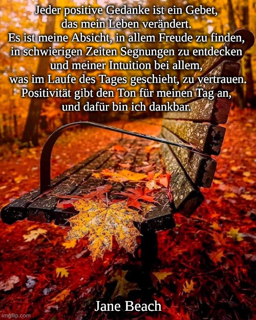 Jeder positive Gedanke ist ein Gebet, das mein Leben verändert. Es ist meine Absicht, in allem Freude zu finden, in schwierigen Zeiten Segnungen zu entdecken und meiner Intuition bei allem, was im Laufe des Tages geschieht, zu vertrauen. Positivität gibt den Ton für meinen Tag an, und dafür bin ich dankbar.