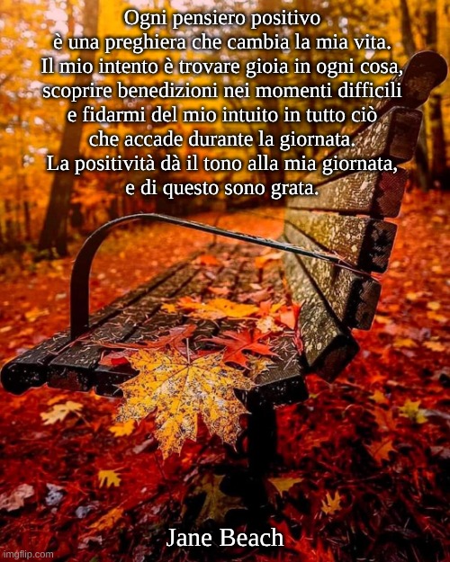 Ogni pensiero positivo è una preghiera che cambia la mia vita. Il mio intento è trovare gioia in ogni cosa, scoprire benedizioni nei momenti difficili e fidarmi del mio intuito in tutto ciò che accade durante la giornata. La positività dà il tono alla mia giornata, e di questo sono grata.
