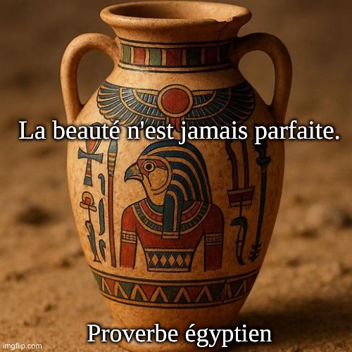 Image: Peter van Geest AI. Signification : La perfection est artificielle, l’imperfection est naturelle et reconnaissable. Origine : Bien qu’il soit difficile d’affirmer avec une certitude absolue qu’un Égyptien en particulier ait prononcé ces mots, la signification mentionnée ici — la leçon religieuse et philosophique d’humilité envers les dieux — correspond exactement à celle attribuée à l’Égypte antique. Il s’agit d’un concept culturel profondément enraciné par opposition à une citation littérale et documentée.