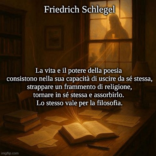 Letterato tedesco, teorico della letteratura, critico d’arte, poeta, filosofo e traduttore. È considerato uno dei pionieri della linguistica comparata. Scrivendo e pubblicando frammenti, Schlegel tentò di costruire un’enciclopedia filosofica.[1] Schlegel diede al Romanticismo tedesco, termine entrato in uso solo intorno al 1810, un fondamento politico in risposta alla crescente influenza della Francia e di Napoleone Bonaparte. Verso la fine della sua vita, fu un difensore dell’eredità cattolica del Medioevo.
