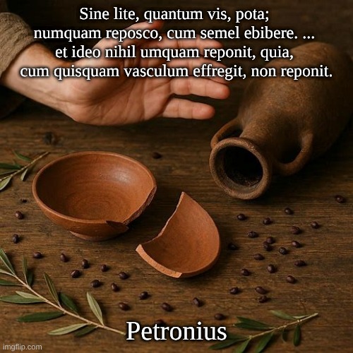 Sine lite, quantum vis, pota; numquam reposco, cum semel ebibere. … et ideo nihil umquam reponit, quia, cum quisquam vasculum effregit, non reponit.