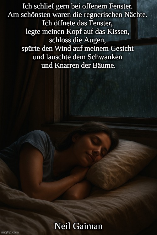 Ich schlief gern bei offenem Fenster. Am schönsten waren die regnerischen Nächte. Ich öffnete das Fenster, legte meinen Kopf auf das Kissen, schloss die Augen, spürte den Wind auf meinem Gesicht und lauschte dem Schwanken und Knarren der Bäume.