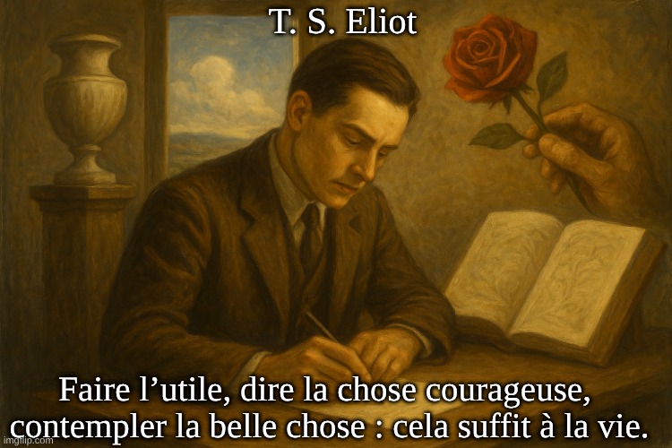 Image: Peter van Geest AI. Signification : Une vie digne et épanouie ne se résume pas à la gloire, au pouvoir ou à l’abondance, mais à trois principes simples et nobles : faire l’utile, dire le courageux, contempler le beau. Ensemble, ces trois principes forment une sorte de boussole morale et spirituelle : agir avec utilité, parler avec courage et penser avec beauté. Eliot suggère que cela suffit, qu’il n’est pas nécessaire de poursuivre un but plus élevé pour vivre une vie pleine de sens. Source : Cette citation est tirée de son ouvrage de 1933, L’Usage de la poésie et l’Usage de la critique, dans lequel il réfléchit au rôle de l’art, de la pensée et de l’action dans la vie humaine.
