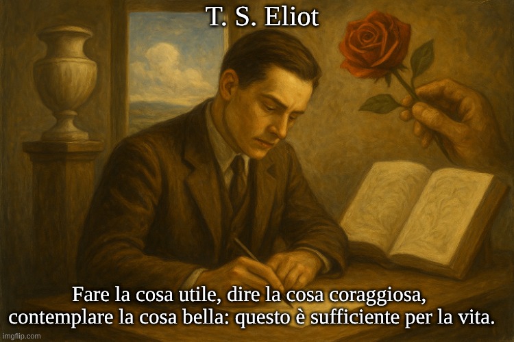 Immagine: Peter van Geest AI. Significato: Una vita degna e appagante non riguarda fama, potere o abbondanza, ma tre semplici e nobili linee guida: fare l’utile, dire il coraggioso, contemplare il bello. Insieme, queste tre cose formano una sorta di bussola morale e spirituale: agire con utilità, parlare con coraggio e pensare con bellezza. Eliot suggerisce che questo è “sufficiente”, che una persona non ha bisogno di perseguire uno scopo più grande per vivere una vita significativa. Fonte: Questa citazione è tratta dalla sua opera del 1933, The Use of Poetry and the Use of Criticism, in cui riflette sul ruolo dell’arte, del pensiero e dell’azione nella vita umana.