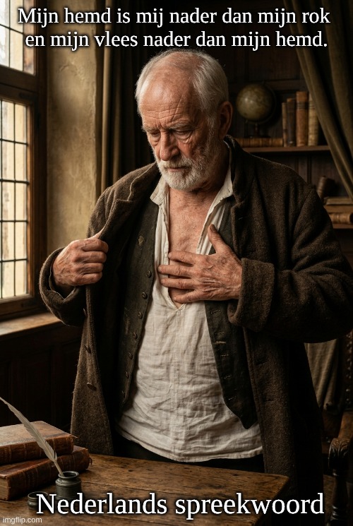 Afbeelding: Peter van Geest AI. Betekenis 📖 : Dit spreekwoord drukt uit dat men in de eerste plaats aan zijn eigen belangen of aan die van zijn naaste familie denkt voordat men anderen helpt. Het gaat over een hiërarchie van nabijheid: Eigenbelang eerst: Men zorgt eerst voor zichzelf en zijn eigen hachje. Prioriteiten: Bloedverwanten en goede vrienden gaan voor verre kennissen of vreemden. Fysieke nabijheid: Het beeld gebruikt kledingstukken en het lichaam om de graad van belangrijkheid aan te geven. Hoe dichter bij het lichaam, hoe belangrijker. 🏛️ Oorsprong: De wortels van dit gezegde liggen in de klassieke oudheid.Auteur: Toegeschreven aan de Romeinse blijspeldichter Titus Maccius Plautus (ca. 254 – 184 v.Chr.). Bron: In zijn komedie genaamd ´Trinummus´ (De drie geldstukken) schreef hij de Latijnse zin: “Tunica propior palliost” Letterlijke vertaling: “Het onderkleed (tunica) is nader dan de mantel (pallium).”Evolutie: Door de eeuwen heen is de uitdrukking in vele talen overgenomen en uitgebreid. In de Nederlandse versie is later “het vlees” toegevoegd om aan te geven dat het eigen leven of de eigen gezondheid nog belangrijker is dan bezit of status. 👔 De Symboliek van de Lagen:Het gezegde bouwt een logische ladder op van wat het minst dichtbij is naar wat het meest essentieel is:1.De Rok (Mantel/Jas): Dit is de buitenlaag, het verst van het hart verwijderd. Het staat symbool voor de buitenwereld of verre relaties. 🧥 2.Het Hemd (Onderkleed): Dit zit direct op de huid. Het staat symbool voor de directe familie en goede vrienden. 👕 3.Het Vlees (Het Lichaam): Dit ben jijzelf. Het staat symbool voor zelfbehoud en de diepste persoonlijke belangen. 🦴 💡 Variaties in andere talen: Dit concept is universeel en komt in bijna elke Europese taal voor: – Engels: “Near is my shirt, but nearer is my skin.” 🏴 – Duits: “Das Hemd ist mir näher als der Rock.” 🇩🇪 – Frans: “La chemise est plus proche que le pourpoint.” 🇫🇷 – Latijn: “Tunica propior palliost.” 📜 ✅ Conclusie: Hoewel het gezegde soms als egoïstisch wordt beschouwd, beschrijft het een menselijk basisinstinct: ´zelfbehoud´.