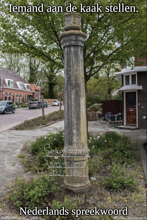 Geselpaal te Farnsum Foto: Saskia Cloo – Hartsema. Betekenis: Iemand openlijk te schande maken. Oorsprong: Vroeger was de kaak en ton, waarop een veroordeelde tot spot van het volk tentoongesteld werd. Later verstond men onder kaak de gerichts- of geselpaal, waaraan misdadigers werden vastgebonden, er staat nog zo’n paal in Farmsum bij Delfzijl.