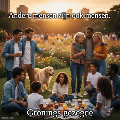 Afbeelding: Peter van Geest AI. Betekenis: De zin benadrukt de gedeelde menselijkheid van alle mensen. Het roept op tot empathie en begrip voor anderen, ongeacht verschillen. Culturele Context: Het gebruik van dialecten zoals het Gronings kan helpen om lokale identiteit en gemeenschap te versterken. Auteur:Oorsprong: Het gezegde is een algemeen bekend uitdrukking in de Groningse cultuur en is niet specifiek toegeschreven aan één enkele auteur of bron. Mogelijke Invloeden: Culturele Achtergrond: Het gezegde kan voortkomen uit volkswijsheden of regionale tradities die de waarden van empathie en respect voor anderen benadrukken. Literatuur en Poëzie: Dergelijke uitspraken worden vaak teruggevonden in lokale literatuur, maar er is geen specifieke auteur die algemeen erkend wordt voor deze uitspraak. Conclusie: Het gezegde weerspiegelt een bredere culturele en sociale boodschap die door de jaren heen is doorgegeven in de gemeenschap, zonder een specifieke auteur.